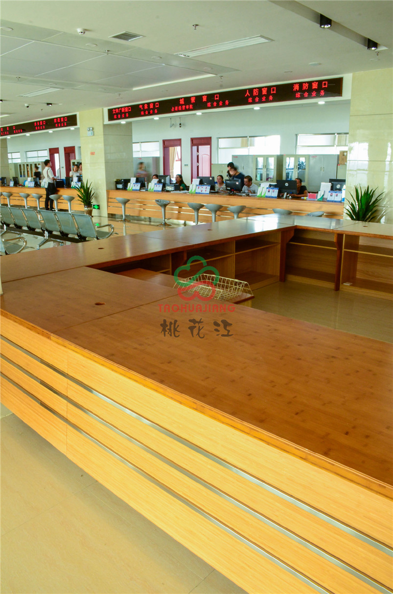 桃江縣政務服務中心是桃江縣委、縣政府為了優(yōu)化投資環(huán)境、提高辦事效率、更好地為廣大群眾和投資者服務而設立的正科級事業(yè)機構(gòu)。政務中心大廳內(nèi)的辦公桌全部使用桃花江竹材科技的普竹材料打造,色澤鮮明,質(zhì)地環(huán)保,整體感覺簡約清新。竹材清正廉潔的高品質(zhì)正好與政務中心的宗旨:陽光行政、勤廉公平、服務至上、便民利民相互呼應。